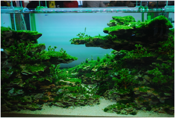 把層巒疊嶂的山峰搬進了缸里,再點綴上翠綠的水草, 這就是今年第二次在CIPS上舉辦的世界水草大師賽。水下造景為公認為是水下微縮園林,是目前正流行的休閑娛樂項目。本屆水草大師賽一共分為40組,共創作了40個水下微縮園林景觀。郎澤華是一位年輕的水景造型師,他的作品《 峭峰春榮》被評定為全場總冠軍。評委會對這件作品的點評是:缸中的石頭,按照由“近大遠小”原則,非常巧妙地組合在一起,營造出了很深的景深。同時,作者利用了很多的小素材,把很多細部做得非常的細致,尤其是前面的化妝紗鋪得很平整,讓人嘆為觀止。峭峰春榮 是一件用心、用智慧、用創意的偉大作品,是本次比賽當之無愧的全場總冠軍。