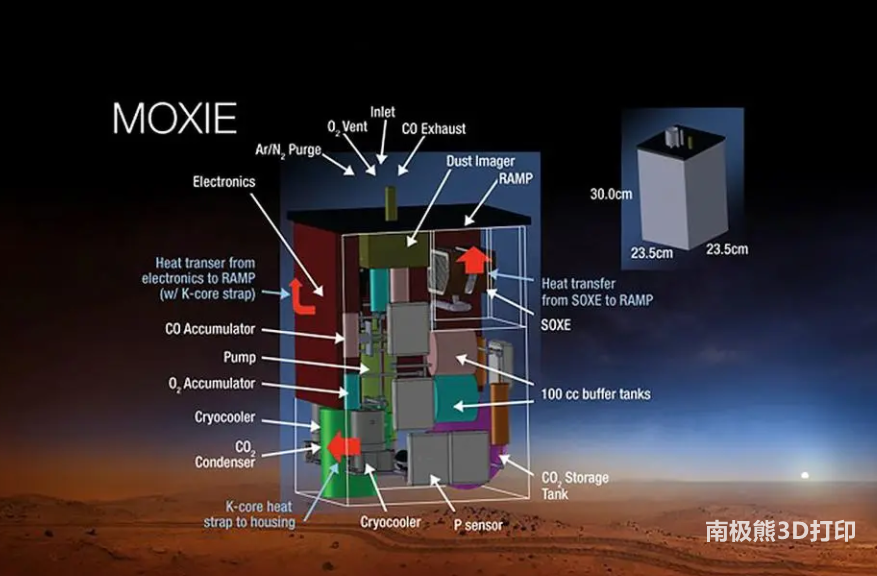 "毅力號(hào) "火星車的其他6個(gè)3D打印部件在 "火星氧氣原位資源利用實(shí)驗(yàn) "儀器中,簡(jiǎn)稱MOXIE。這個(gè)設(shè)備將測(cè)試新的技術(shù),未來(lái)可以生產(chǎn)工業(yè)數(shù)量的氧氣,在火星上制造火箭推進(jìn)劑,幫助宇航員發(fā)射回地球。