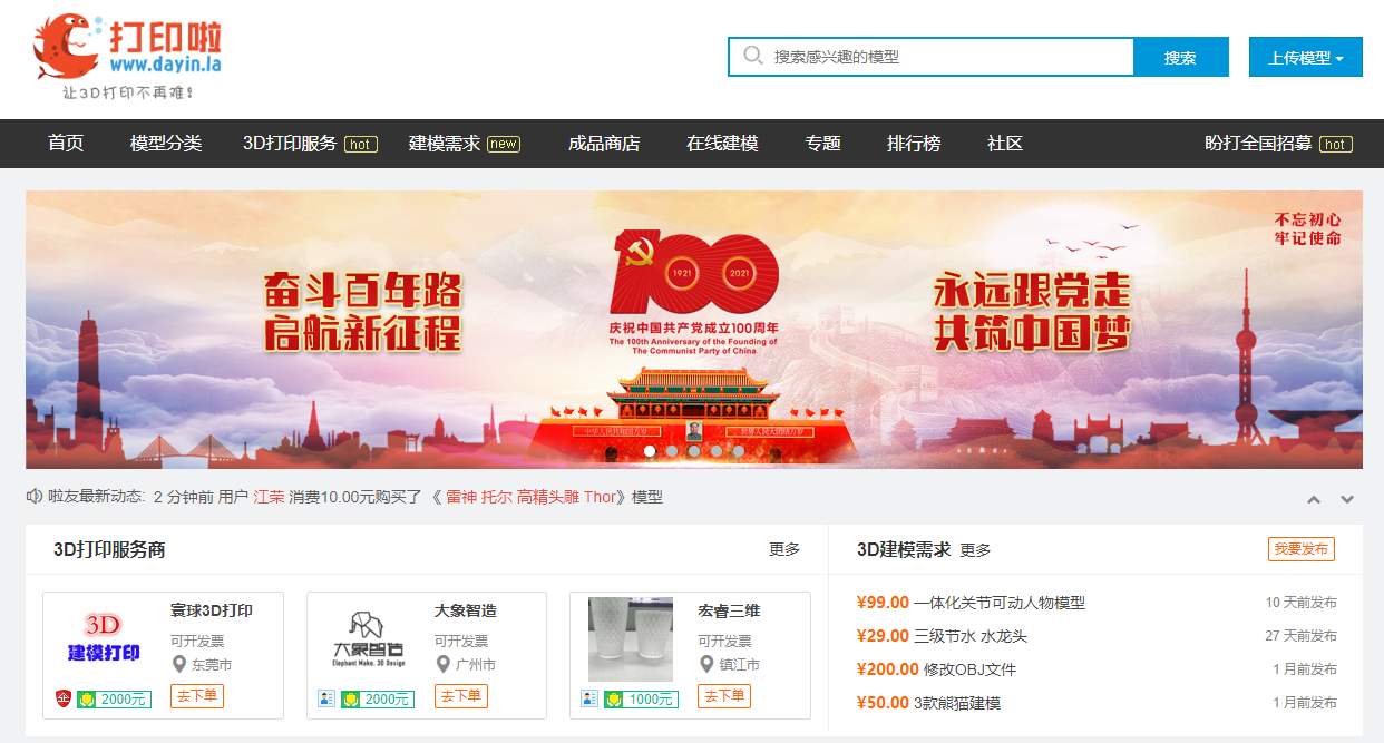 這是一個3D打印資源整合的一個網站,上面涵蓋的內容也很全面,包括打印服務、社區、學習部落等模塊。