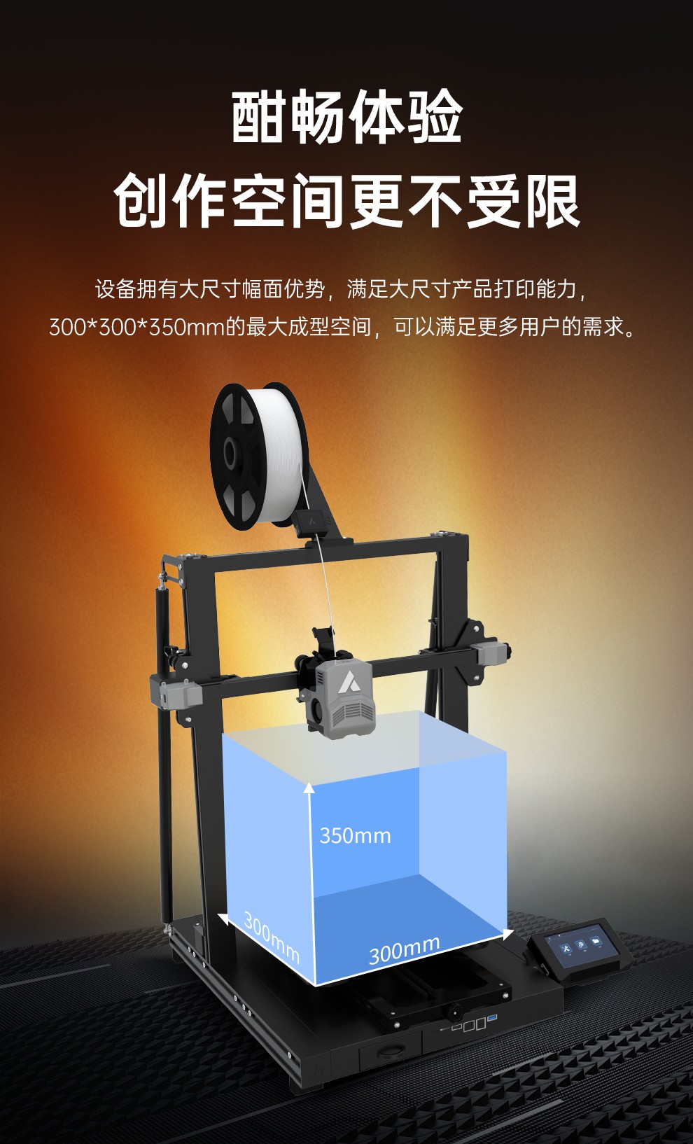300*300*350mm最大成型空間·9.5倍放大擠出,使出料更均勻,成型更出色,搭載智能風扇控制系統,讓高達8500r/min的轉速降低噪音,還可以模型散熱更全面的同時高速打印