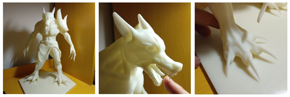 3D打印狼人模型,體積約231x157x290mm,是邵陽(yáng)職業(yè)技術(shù)學(xué)院大三學(xué)生的畢業(yè)設(shè)計(jì)作品。出于對(duì)打印精度與成型效率的要求,該學(xué)生選擇極光爾沃SLA型3D打印機(jī)與白色光敏樹(shù)脂打印這款模型,整個(gè)過(guò)程只耗時(shí)20h左右,最終成品不僅精細(xì)度超過(guò)預(yù)期,而且高度還原了原始的設(shè)計(jì)效果。