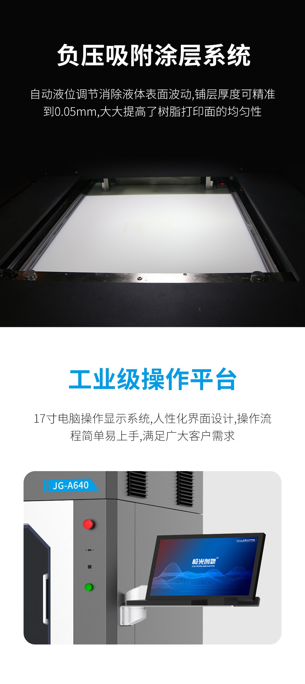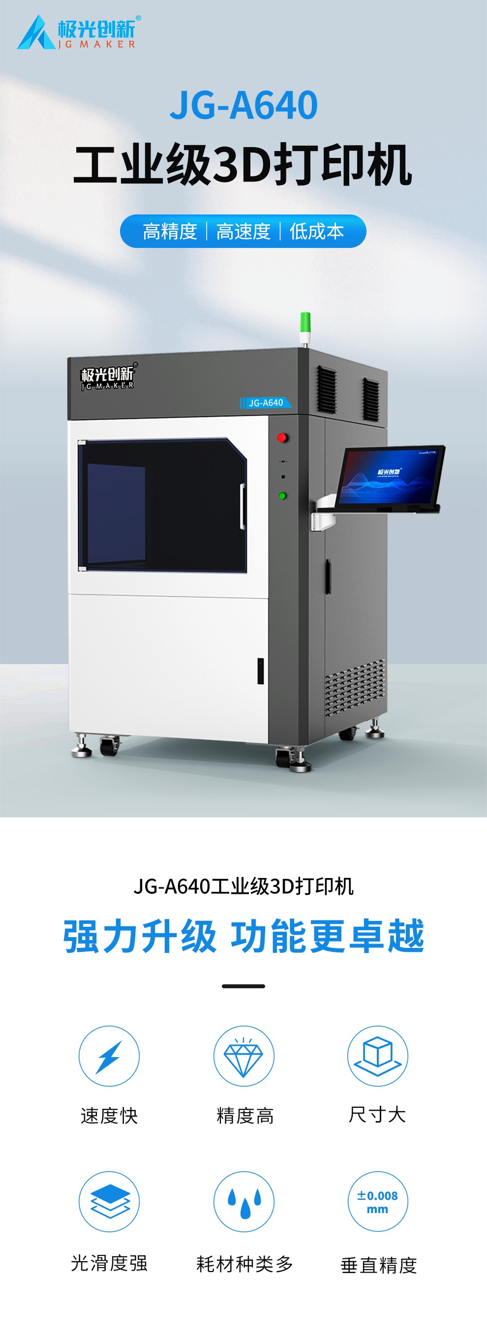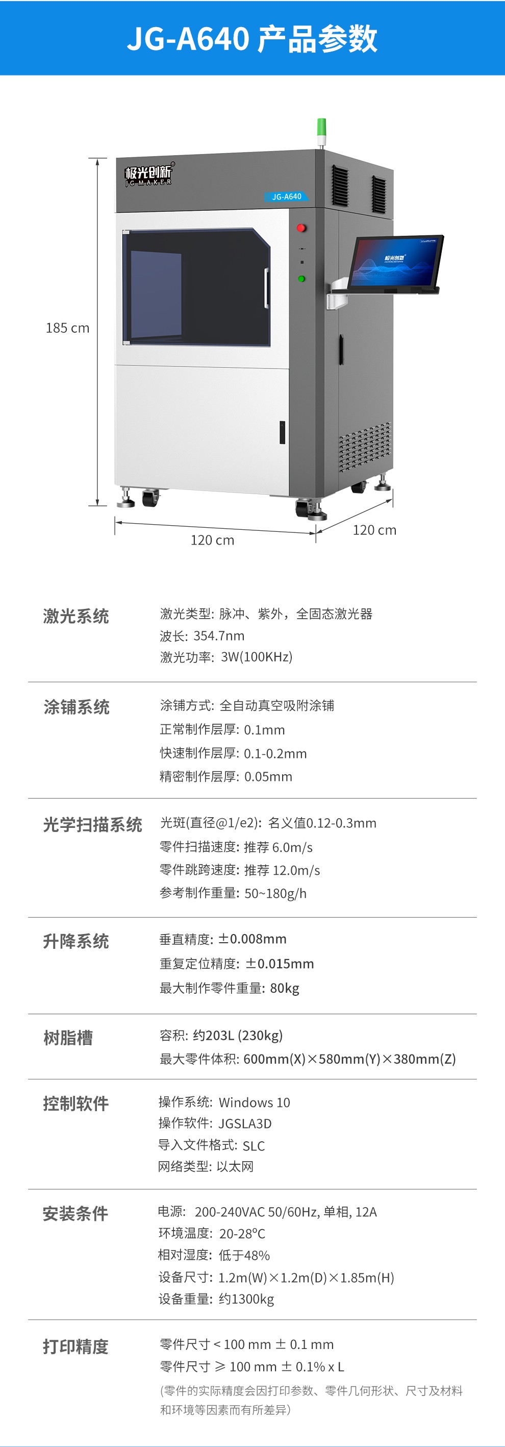 型號JG-A640,其最大成型尺寸可達600mm(X)*600mm(Y)*400mm(Z),精密制作層厚 0.1mm,極大程度的滿足了用戶對尺寸與精度需求,同時使用全固態激光器。